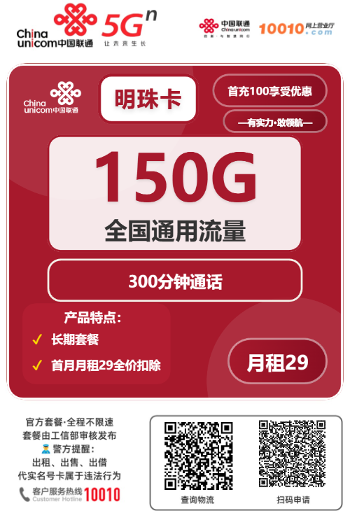 总结:29元150G通用流量+100分钟通话,长期月租优惠,官方正规出品,支持5G,全国通用无地域限制,自主激活便捷,适合流量需求大、通话刚需用户,性价比之选,流量卡推荐,长期套餐,高性价比联通卡。