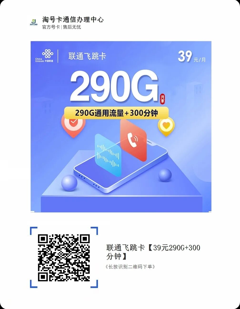 总结:联通飞跳卡39元290G通用流量+300分钟套餐,月租低流量大,全国通用,官方正规,5G支持,性价比高,无合约异地可注销,大流量卡,高性价比联通卡,长期稳定资费。