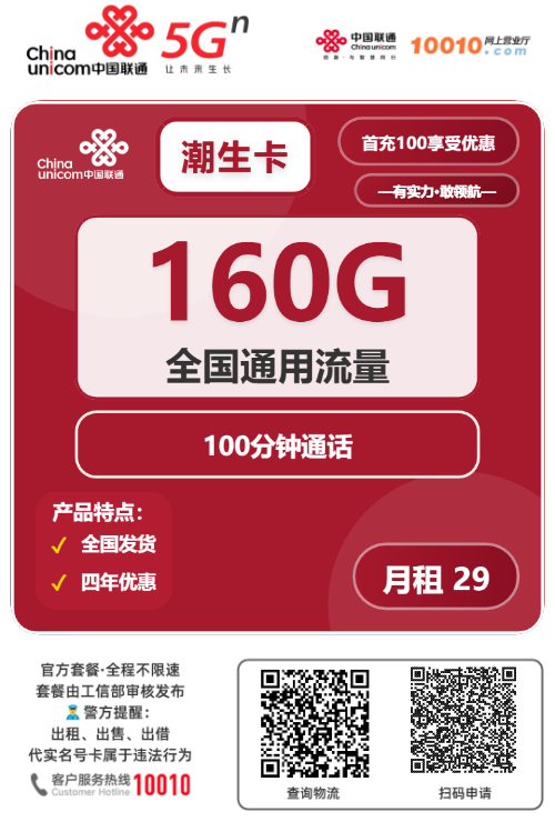 总结:29元的超低月租,提供高达160G的通用流量和100分钟通话,性价比极高,适合流量需求大的用户。四年优惠期稳定,适合长期使用,且全国可下单发货,便捷高效。适合学生、上班族及频繁上网人群,满足日常上网与通话需求,